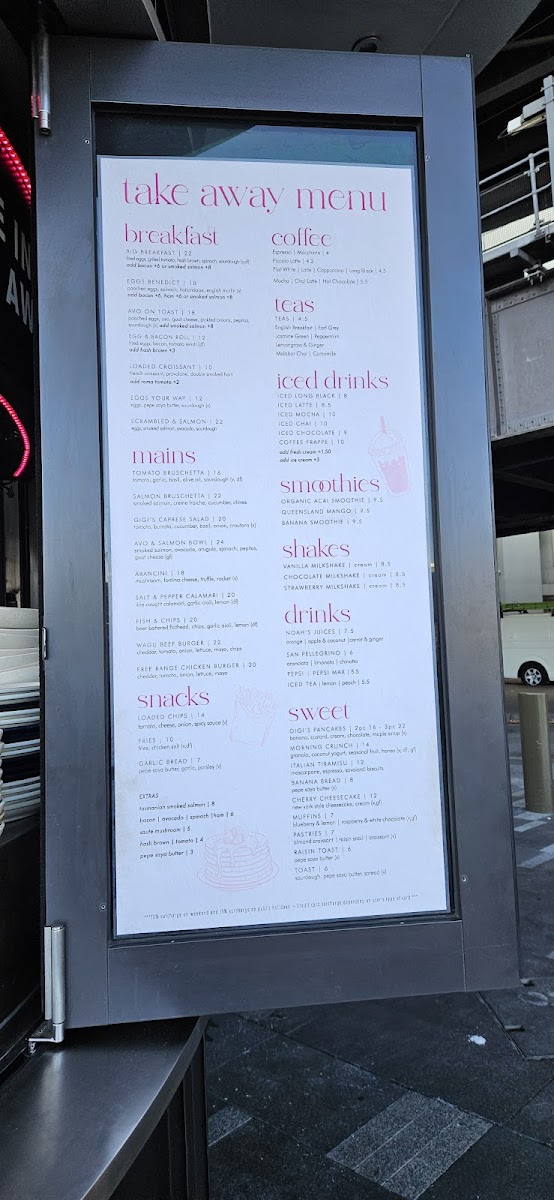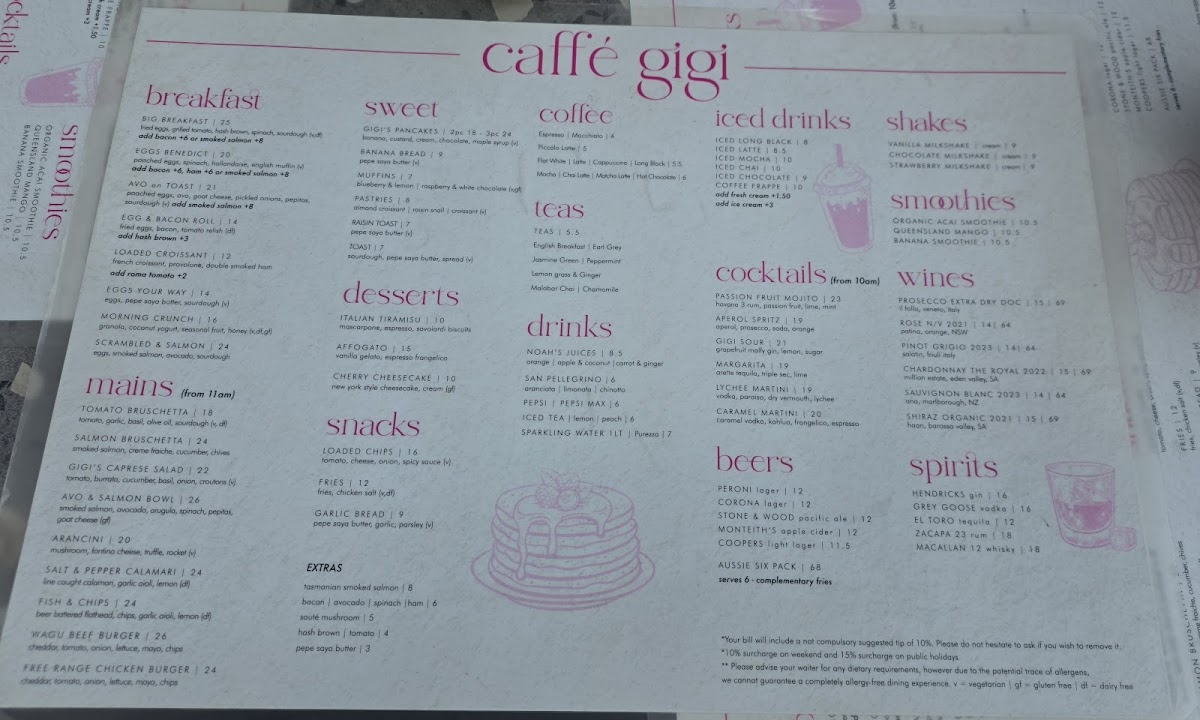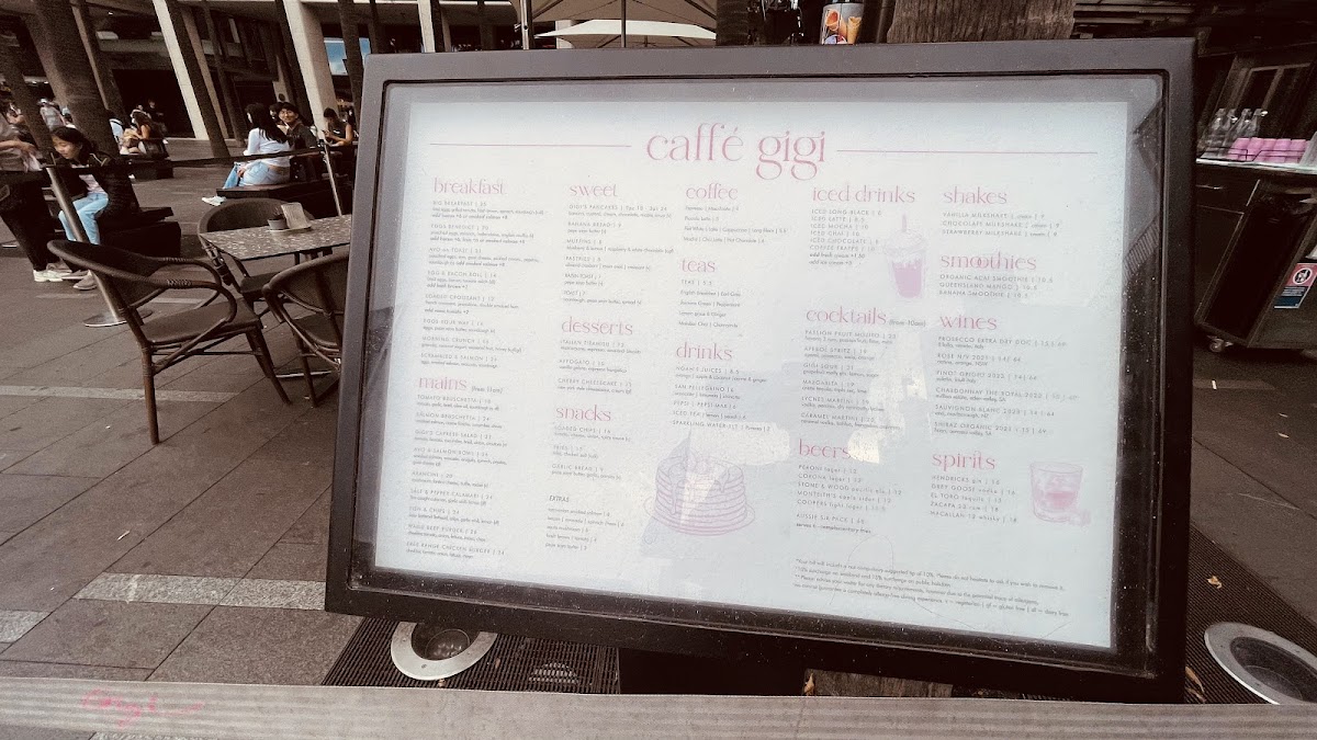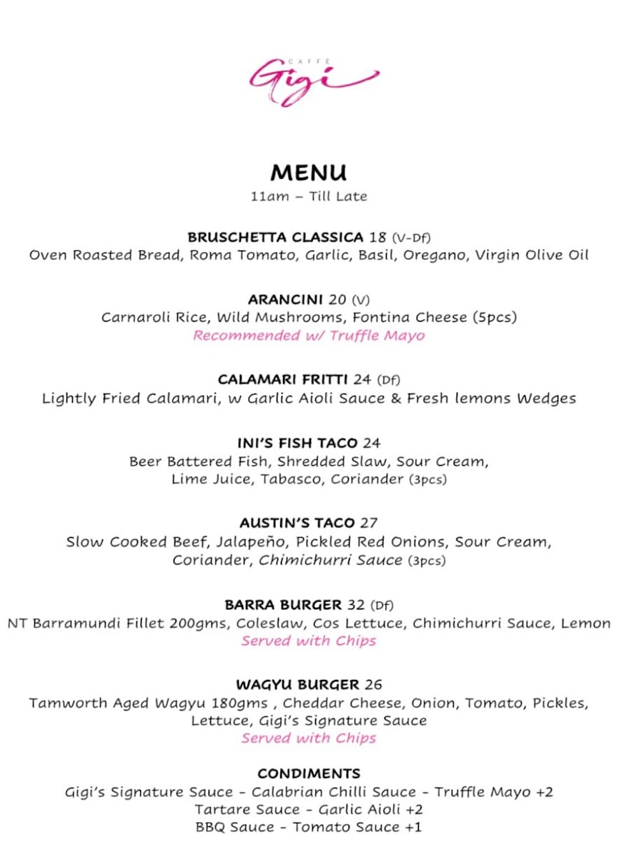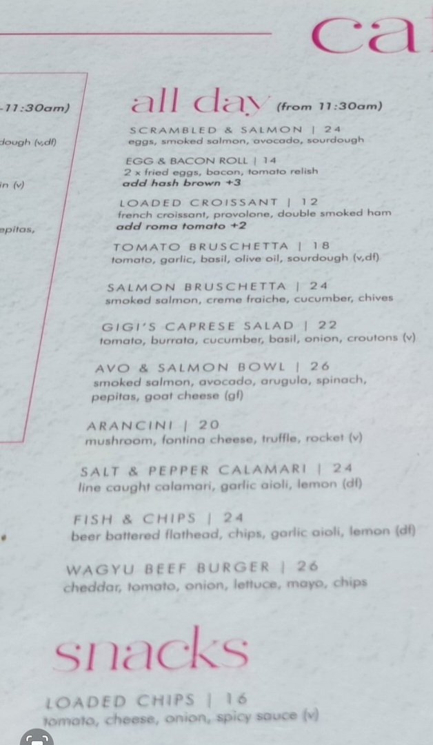 - All Day Food: The menu features diverse dishes including breakfast staples like Scrambled Eggs with Salmon and Egg & Bacon Rolls, as well as light meals such as Bruschetta Classica (Tomato Bruschetta and Salmon Bruschetta), Gigi's Caprese Salad, and Avo & Salmon Bowl. Other options include Salt & Pepper Calamari, Fish & Chips, and a Wagyu Beef Burger.